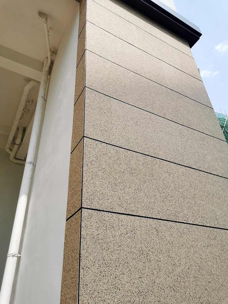 裙樓采用仿花崗巖貼片,不但達(dá)到預(yù)期的設(shè)計(jì)效果,綜合成本更降低至天然石材的三分之一。